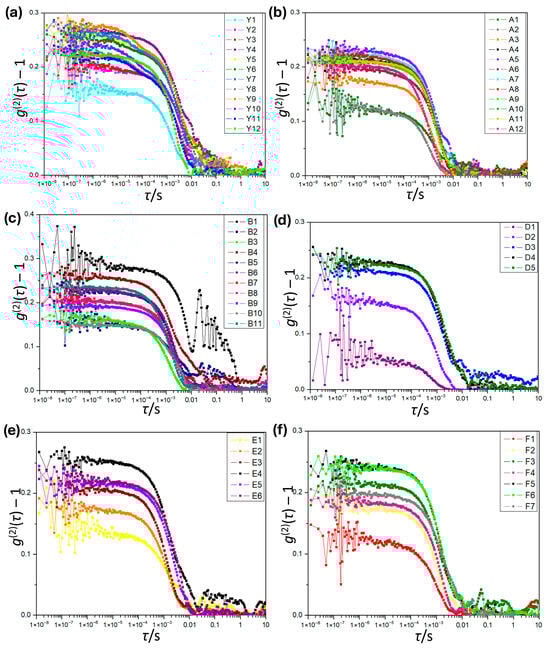 Dynamic light scattering correlation curves at 25 °C for the ternary water/ethanol/n-pentanol system. (a) series Y; (b) series A; (c) series B; (d) series D; (e) series E; (f) series F.
