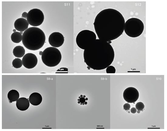 Transmission electron micrographs of silica particles synthesized in the SFME system water/ethanol/n-pentanol. Sample labels S9–S12 correspond to the compositions shown in Figure 7.