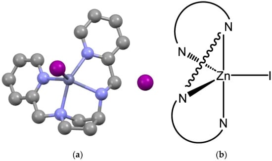 The iodido complexes of L3 and L4 with Zn(II) showed significantly different solubility behaviour to the chlorido derivatives by being poorly soluble in chlorohydrocarbons but freely soluble in dmso. These observations immediately suggested a change in composition, going from Zn(L)Cl2 to Zn(L)I2. The solubility of the iodido complexes suggested a formulation of [Zn(L3/L4)I]I with five-coordinate complex cations and unbound I− counterions. This was confirmed for [Zn(L3)I]I by SCXRD analysis with the molecular structure determined as a result, shown in Figure 5. Inspection of the structure reveals the complex to be five-coordinate with an approximate trigonal bipyramidal geometry defined by a trigonal plane comprised of one of the pyridine donors, the iodide, and the secondary nitrogen; this is distinct from the arrangement observed in the neutral [Zn(L1)Cl2] and [Zn(L2)Cl2] complexes. The remaining donors lie along the z axis, which shows considerable distortion, highlighted by an N-Zn-N bond angle of 143.7(3)°. The five-membered chelates have typical bite angles of slightly less than 80° but deviations from the ideal are evident in the trigonal plane, with L-M-L angles ranging from 110.9(2)° for N2-Zn1-I1 to 131.8(3)° for N2-Zn1-N4. The stereochemistry at both coordinated nitrogens is R and the configuration about the metal, as defined by consideration of chiral edges [24], is Λ (Figure 5). The Zn-N bond lengths vary from 2.094 to 2.185 Å and are consistent with those of 2.120(2), 2.218(2), 2.136(2), and 2.195(2) Å reported for a similar complex of the type [Zn(N4)Cl]ClO4 [21]. Other metrics are typical and are included in the Supplementary Materials. The adoption of a lower coordinate structure for the diiodido complexes compared to the dichlorido species is likely due to sterics with six-coordination being disfavoured for the larger I− ligands. The nature of the azacyclic backbone is a contributory factor, as the relatively fixed orientation of the (CH2)2 and (CH2)3 bridges in L3 and L4 do impact the coordination sphere, as noted in the solid-state structures.