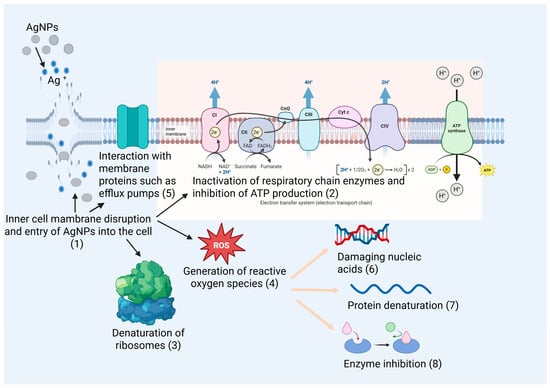 A well-documented cytotoxic effect of silver-based nanomaterials on pathogenic bacteria is their ability to disrupt the integrity of the cell membrane barrier, thereby altering its permeability. In addition to its protective function, the bacterial cell membrane also serves as the site of key metabolic pathways, including the electron transport chain and oxidative phosphorylation. The attachment of metal nanoparticles to bacterial cell membranes is driven by various intermolecular forces, such as electrostatic attractions, van der Waals forces, receptor–ligand interactions, and hydrophobic effects [29,52,53,54].
