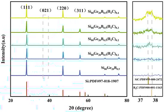 Figure 2 displays the XRD patterns of SiGe-based sintered samples with varying B4C contents (x = 0~0.4 wt%). The XRD results indicate that the diffraction peaks of all the samples present excellent agreement with the standard Si pattern (PDF#97-018-1907). The three main diffraction peaks located at 28.2°, 47°, and 55.7° indicate the formation of well-crystallized SiGe alloys corresponding to the (111), (220), and (311) crystal planes of Si, respectively. It was also observed that the augmented intensities of main peaks (111) with the increased B4C content were attributed to the increase in crystallinity of the SiGe matrix after the addition of B4C. Additionally, the average grain size increased from 44 nm to a maximum of 87 nm as calculated in the table. In recent decades. As the B4C content increases, a portion of the B4C reacts with the Si-containing matrix, forming SiC and B-rich phases near the grain boundaries. These B-rich intergranular phases significantly accelerate local material migration processes, effectively enhancing grain boundary mobility. Such enhanced grain growth behavior of sintered composites was observed in other SiGe-based alloys [28,29]. The partially enlarged details presented on the right of Figure 2 clearly show the presence of B4C and SiC peaks. Additionally, the peak intensities corresponding to B4C and SiC at angles of 2 θ = 37.5 ° and 2 θ = 37.7 ° becomes more pronounced as the content of B4C increases (Figure S1).