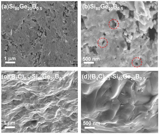 Figure 3. (a) The cross-sectional SEM view of the (B4C)0.1-Si80Ge20B0.5 sample, and (b) is a locally enlarged image of (a). (c) The cross-sectional view of the sample (B4C)0.3-Si80Ge20B0.5, and (d) is a locally enlarged image of (c).