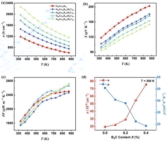 Figure 5. The variation trends of Si80Ge20B0.5-(B4C)x (x = 0~0.4 wt%) samples with respect to temperature for (a) electrical conductivity σ, (b) Seebeck coefficient S, (c) PF. (d) The carrier concentration n and carrier mobility µ depending on the change of B4C content.