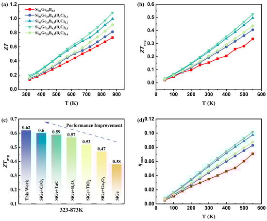 Figure 7. Temperature-dependent (a) ZT of samples Si80Ge20B0.5-(B4C)x (x = 0~0.4 wt%), (b) engineering dimensionless Z T e n g . (c) The average values of Z T a v g in this work are compared with those reported studies [10,16,17,18,23,24] and (d) the maximum efficiency η m a x .