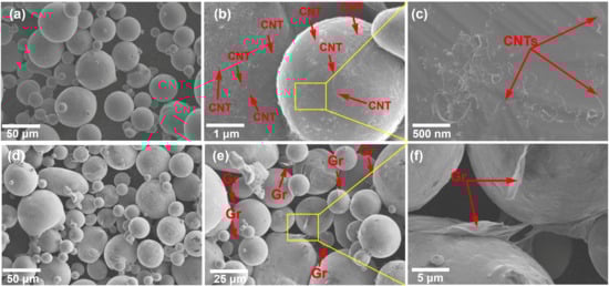 SEM images with different magnification of (a–c) Ti alloy-CNT powder with 3 vol.% CNTs and (d–f) Ti alloy-Gr powder with 3 vol.% Gr.
