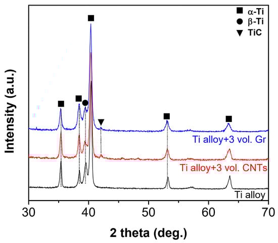 Figure 4 presents the XRD patterns of the prepared samples. All samples exhibit the characteristic diffraction peaks of the α-Ti and β-Ti phases. In the composite samples, besides these typical peaks, an additional peak appears at 2θ ≈ 42° corresponding to (200) reflection reflections of the TiC (JCPDS 65-7994). This observation provides clear evidence for the formation of TiC in the composite. The potential reaction at the interface between CNTs or Gr and the Ti matrix, leading to the formation of interphases such as TiC as reported in the previous studies [33,34,35].