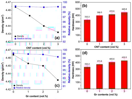 Effect of carbon contents on the relative density and hardness of (a,b) CNT/Ti alloy composite and (c,d) Gr/Ti alloy composites.