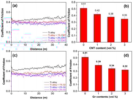 Effect of carbon contents on the COF curves and the average COF of (a,b) CNT/Ti alloy composite and (c,d) Gr/Ti alloy composites.