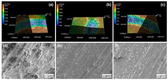 Figure 8a–c shows the surface morphology of the wear tracks for the Ti alloy, CNT/Ti alloy composite, and Gr/Ti alloy composite after the friction tests. As observed, the wear track of the Ti alloy exhibits a significantly greater width and depth compared to those of the composites. This observation indicates that the material loss during the wear test was substantially higher for the Ti alloy than for the composite samples. To further elucidate the wear mechanisms, the worn surfaces of the Ti alloy and composite samples were examined by SEM (Figure 8d–f). As shown in Figure 8d, the worn surface of the Ti alloy is relatively rough, characterized by numerous pits and small detached particles. This morphology is consistent with the high friction coefficient measured earlier. In contrast, the worn surfaces of the CNT/Ti alloy and Gr/Ti alloy composites appear much smoother, with finer debris distributed across the surface and without the presence of pits or delamination features observed in the Ti alloy (Figure 8e,f). These morphological observations are in good agreement with the COF results discussed above, confirming that the incorporation of CNTs and Gr effectively reduces friction in Ti alloy composites.