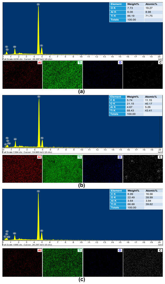 EDS spectra and EDS mapping of worm surface of (a) sintered Ti alloy, (b) CNT/Ti alloy composite containing 3 vol.% CNTs and (c) Gr/Ti alloy composite containing 3 vol.% Gr.