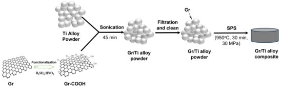 The fabrication process of the Gr/Ti alloy composites was similar to that used for the CNT/Ti alloy composites, as illustrated in Figure 13. Initially, Gr was surface-functionalized to obtain carboxyl-functionalized graphene (Gr–COOH), which was then dispersed in ethanol to prepare a Gr–COOH suspension with a concentration of 1 g/L. Subsequently, Ti alloy powder was added to the Gr–COOH suspension and mixed using ultrasonic agitation to ensure uniform dispersion of the Gr within the matrix. The resulting mixture was vacuum-filtered and dried to obtain the Ti alloy–Gr composite powders. Finally, the composite powders were consolidated using a SPS system (LABOX 350, Sinter Land Inc., Japan). The Ti alloy–Gr mixtures were sintered at 950 °C for 30 min under an applied pressure of 30 MPa in a vacuum environment to produce Gr/Ti alloy composites with graphene volume fractions of 1%, 2%, and 3 vol.%.