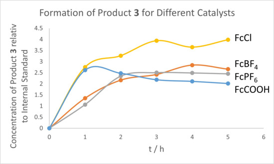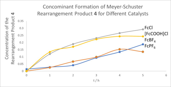 In turn, catalysts FcCl and [FcCOOH]Cl form higher amounts of the Meyer–Schuster rearrangement product 4 (Figure 5), despite the lower observed rate constants for the formation of 4 compared to the other catalysts. It appears that the catalysts FcBF4 and FcPF6 form the rearrangement product 4 slower, and with an induction period, whereas the catalysts FcCl and [FcCOOH]Cl form it faster and without an induction period. It is well established in battery research that BF4− and PF6− can undergo decomposition, potentially producing HF [56,57]. The induction period observed in Figure 5 for the two catalysts bearing these counterions may therefore indicate that their decomposition products, like HF, themselves are catalytically active. The larger observed rate constant for the consumption of the starting material with the catalysts FcCl and [FcCOOH]Cl may be related to the fact that they also concomitantly produce the Meyer–Schuster rearrangement products, and a conversion of the product 3 to the rearrangement product 4 may also occur over time. Still, the different catalysts have a different propensity to produce the Meyer–Schuster rearrangement product 4. As mentioned before, the reactions may also produce side products that are not detectable by GC, such as oligomers or polymers, which could influence the overall amount of product formed during the reaction.