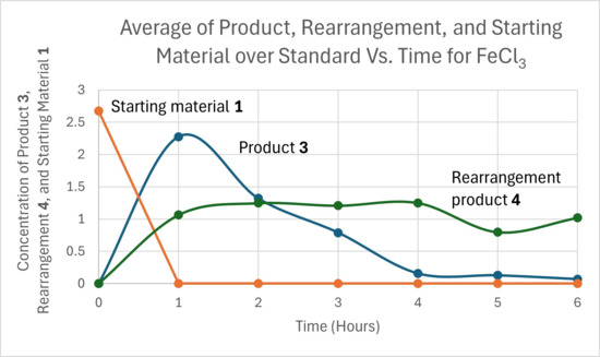 Formation of the substitution product 3 and the Meyer–Schuster rearrangement product 4 over time for FeCl3 as the catalyst, average of two runs.