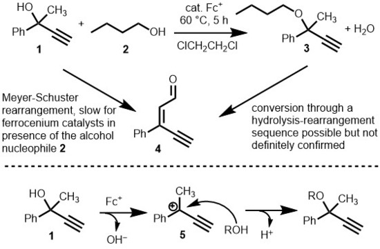 During our long-term interest in the catalytic activity of propargylic alcohols, we discovered that the ferrocenium cation catalyzes the substitution of the OH group in propargylic alcohols (such as 1) by alcohol nucleophiles (such as 2) to afford propargylic ethers 3 (Scheme 1) [45,46]. Certain propargylic ethers display biological activity [47]. We assume an ionic mechanism and that the ferrocenium cation serves as a Lewis acid, albeit we have not performed in-depth catalytic studies. The Meyer–Schuster rearrangement of propargylic alcohol 1 to the α,β-unsaturated aldehyde 4 (Scheme 1) is a reaction in its own right [42,48]; however, in the context of propargylic substitution reactions, it is a yield-diminishing side reaction. Mechanistically, we propose that the propargylic substitution reaction proceeds through the carbocation intermediate 5 (Scheme 1, bottom). This is supported by the observation that electron-donating substituents, or those that stabilize the positive charge on the central carbon atom in 5, accelerate the reaction [45]. Further mechanistic insights were obtained in this study with a radical scavenger experiment, and a radical mechanism cannot be excluded.