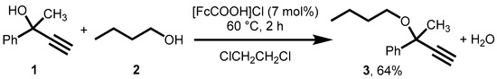 Catalytic reaction between propargylic alcohol 1 and butanol (2) to afford the product 3 with [FcCOOH]Cl as the catalyst.