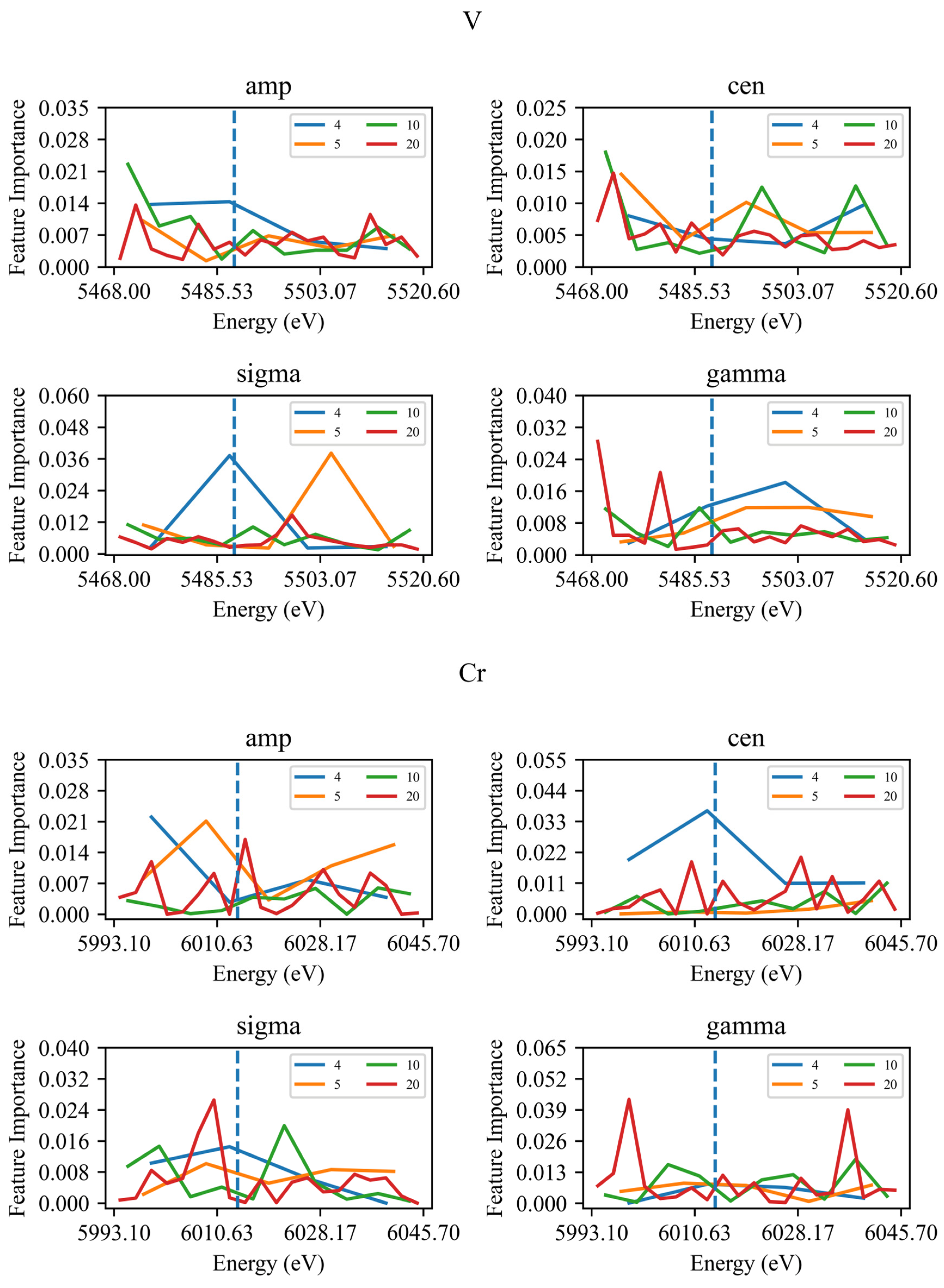 When the absorbing element is V, the peak height and peak position in the pre-edge region are strong predictive indicators, with normalised feature importance sums of 0.0788 and 0.0816, respectively. However, the standard deviation of the Gaussian linear function in the post-edge region exhibits a sum of 0.0884 when the spectrum is divided into four and five equal parts, while the sum for the Lorentzian line half-width in the post-edge region is 0.0733 when the spectrum is divided into four and five equal parts, which is close to the sum for peak height and peak position in the pre-edge region across the four scales. When the absorbing element is Cr, for the three features—peak height, Gaussian linear function standard deviation, and Lorentzian linear function half-width—the maximum importance value across all scales, except for peak height in the four-division spectrum, which occurs in the edge-of-band region. This aligns with the conclusion proposed by Tanaporn Na Narong et al. regarding the prediction of coordination numbers, which states that the edge-of-band region possesses non-negligible importance relative to the edge-of-band peak [