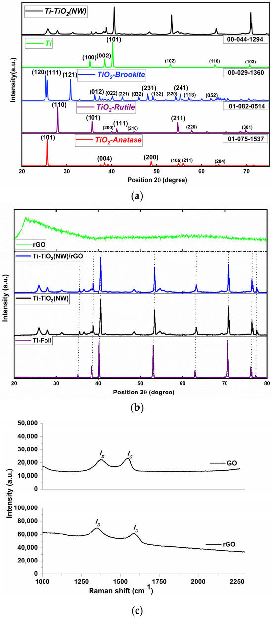 X-ray patterns for (a) as-synthesized structures of Ti-TiO2(NW); (b) as-development hybrid electrode of Ti-TiO2(NW)/rGO. Raman spectra of the hybrid electrode (c).