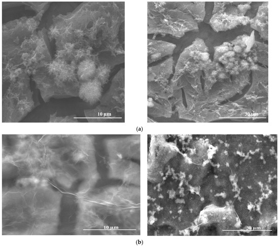 Figure 3 shows the SEM morphologies of the Ti-TiO2(NW) and Ti-TiO2(NW)/rGO hybrid electrodes. It can be observed in Figure 3a that the Ti foil presents a significant change in the morphology after the corrosion process and the hydrothermal treatment (72 h at 80 °C). The titanium foil surface was preferentially corroded, favoring the formation of channels on the surface so that the TiO2 nanowires grew irregularly with a random orientation on the islands on the surface of the electrode. It was also found that the average thickness of the TiO2 nanowires is 0.0548 µm (measured using ImageJ software Version 1.53t). In the case of the Ti-TiO2(NW)/rGO structure (Figure 3b), even though channels form on the electrode surface following the corrosion process, the TiO2 nanowires have formed island conglomerates. Thus, the uniform deposition of rGO on the electrode surface was evident.