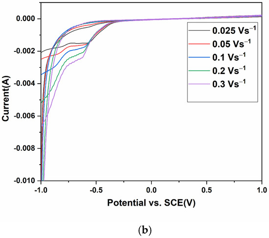 A—represents the geometric surface area of the sensor (cm2)—0.8; n—represents the number of participating electrons in the reaction, equal to 1; D—represents the diffusion coefficient of the molecules in solution (cm2 s−1)—4.52 cm2 s−1; C—is the molar concentration of K3Fe(CN)6 3H2O in the solution (i.e., 4 mM); and v—represents the scanning speed (V s−1).