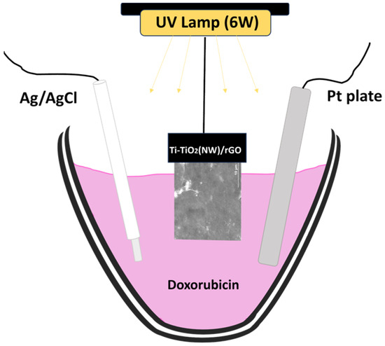 Schematic representation for testing the Ti-TiO2(NW)/rGO using 0.1 M NaCl supporting electrolyte and 2.5 mg L−1 DOX.