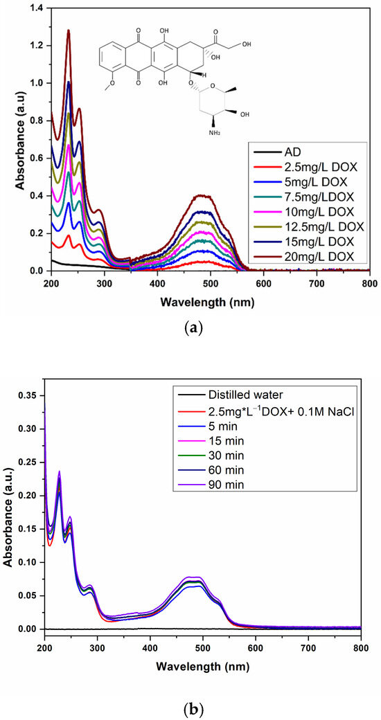 UV-VIS spectra for 2.5, 5, 7.5, 10, 12.5, 15, and 20 mg L−1 DOX (a); UV-VIS spectra for 2.5 mg L−1 DOX in 0.1 M NaCl supporting electrolyte and under UV irradiation (b).