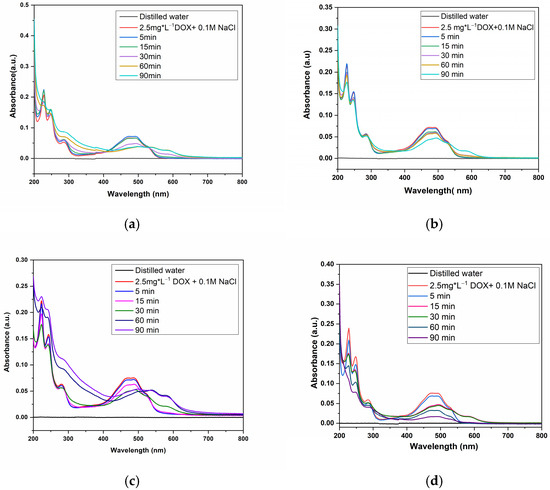 In order to choose the optimal pollutant concentration for testing the hybrid electrode, with an effective surface of 0.5 × 0.8 cm2, we realized an absorbance spectrum varying the doxorubicin concentration for 2.5, 5, 7.5, 10, 12.5, 15, and 20 mg L−1. Due to the small surface of the electrode, it was established that the optimal concentration for degradation processes is 2.5 mg L−1 DOX. Also, for the electrooxidation and photo-electrooxidation processes, the initial concentration is one of the most important parameters for the degradation of compounds. As a contaminant with a lower concentration, access to the electrode surface, secondary products, and organic intermediates is easier [47]. Following the UV-Vis spectrum of DOX, the absorbance peaks were monitored at different wavelengths, being recorded at the values of A232, A253, A290, and A486 nm, as presented in Figure 6a.