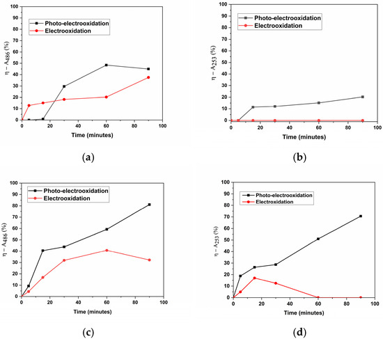 In this study, the DOX degradation efficiency using the Ti-TiO2(NW) and Ti-TiO2(NW)/rGO electrodes was evaluated and compared separately in the electrooxidation and photo-electrooxidation processes (Figure 8). Figure 8a,b shows that using Ti-TiO2(NW) supports the DOX degradation efficiency for η-A486, which was about 45% after 90 min within the photo-electrooxidation process, and only 20% for η-A253. Figure 8c,d shows that the kinetics of color removal by electrooxidation are significantly slower than those for photo-electrooxidation. The initial color A486 of DOX using a Ti-TiO2(NW)/rGO electrode is reduced by 35% by the electrooxidation process (Figure 8c). Under UV irradiation and applied potential within the photo-electrooxidation process, an 80% degradation rate after 90 min of treatment was achieved (Figure 8d). UV irradiation produces free radicals that can oxidize organic compounds by affecting some electrooxidation process products.