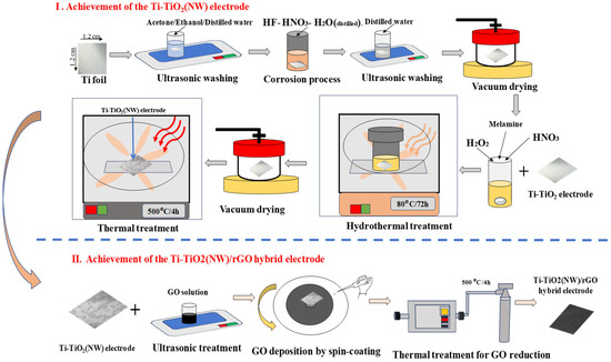 I. Achievement of Ti-TiO2(NW) electrode: First, Ti-TiO2(NW) electrode corrosion of the Ti foil was achieved and finally subjected to a hydrothermal treatment. Thus, Ti foil (effective area 1 × 1.2 cm2) was cleaned in acetone, ethanol, and distilled water for 10 min in an ultrasonic bath. Afterward, the Ti foil was corroded by being treated in a mixed solution of HF: HNO3: DW (2:3:6) for 10 min in order to remove the first layer of oxide (naturally formed on the surface of the Ti foil), and after that, the foil was rewashed in distilled water, ultra-sounded for 10 min, and dried in a vacuum at 60 °C. The growth of the TiO2(NW) was done using chemical oxidation with melamine as a soft template in consistency with other studies [40]. Thus, the corroded Ti foil was placed in the autoclave for hydrothermal treatment, together with a mixed solution of 15 mL of H2O2, 0.3 g of melamine, and HNO3, and kept for 72 h at a temperature of 80 °C. After hydrothermal treatment, the Ti-TiO2(NW) electrode was washed, dried in a vacuum, and treated in the oven at 500 °C for 4 h.