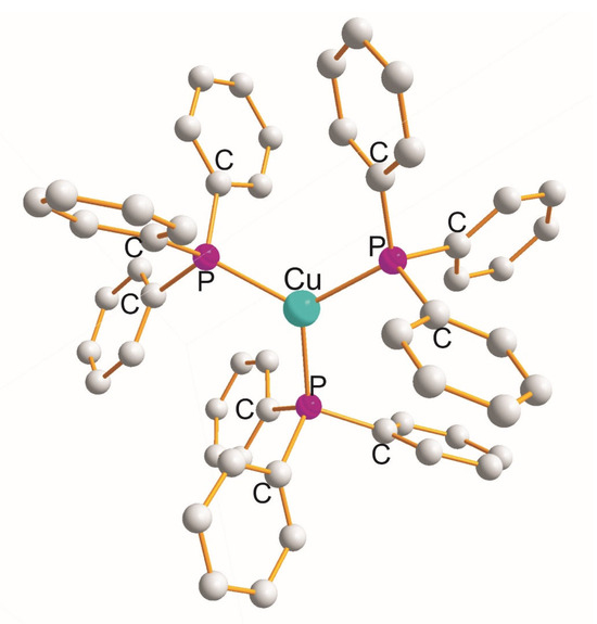 In triclinic [Cu(Ph3P)3][VCO)6] [32] and monoclinic [Cu{PPh2BH2NMe3}3]BF4.1.69 CH2Cl2 [33], monodentate P-donor ligands build up a Cu(P)3 inner coordination sphere. X-ray data show that angular distortion from regular trigonal geometry especially occurs in the monoclinic complex. The Cu-P bond distances and P-Cu-P bond angles, triclinic vs. monoclinic are: 2.295 (±2) Å and 120.0 ±(2.6)° vs. 2.315 (±14) Å and 120.0 (±8.6)°, respectively. As an example, the structure of [Cu(PPh3)3]+ [32] is illustrated in Figure 5 [32]. In the case of halogenated complexes (Figure 6 and Figure 7), there is an ionic bond within the complex anion and two cation organic molecules.