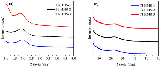 Small-angle XRD patterns (a) and wide-angle XRD patterns (b) of hierarchically porous titanosilicate hollow spheres with various Ti contents: Ti-HHS-1, Ti-HHS-2, and Ti-HHS-3.