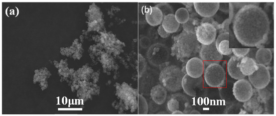 SEM images of Ti-HHS-3. (a) ×2000, and (b) ×50,000, the red square indicates the original location of the enlarged image, which is situated in the upper right corner.
