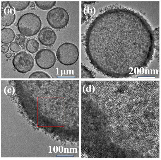 The SEM and TEM images of Ti-HHS-3 are shown in Figure 3 and Figure 4, respectively. The SEM images (Figure 3) reveal that Ti-HHS-3 has a uniform spherical morphology with particle sizes ranging around several hundreds of nanometers and exhibits good particle dispersion. Figure 3b shows a rough particle surface with visible macropores. The TEM images in Figure 4a confirm that the hollow spherical shell structure is consistent across the sample, supporting the observations from the SEM images. Figure 4b indicates that the shell thickness ranges from 20 to 40 nanometers. Figure 4d, an enlarged view of Figure 4c, highlights the uniformly distributed wormhole structure within the particles, further emphasizing the hierarchical porous characteristics of the sample [36,37].