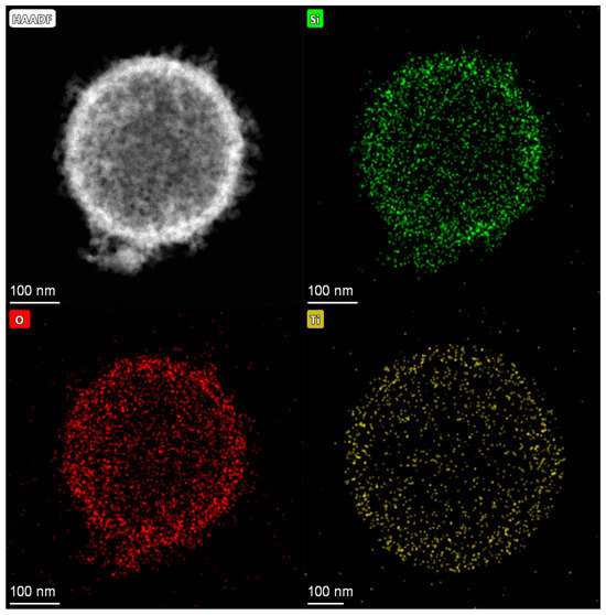 The EDS mapping for Ti-HHS-3, presented in Figure 5, characterizes the Ti distribution within the sample. The mapping confirms a uniform distribution of Ti throughout the hollow sphere structure, with no evidence of local aggregation or clustering. These results validate the successful incorporation of Ti into all three samples. The titanium content in the sample was determined by ICP-AES; the Ti content of Ti-HHS-1, Ti-HHS-2, and Ti-HHS-3 are 0.55 wt%,1.46 wt%, and 2.60 wt%, respectively.