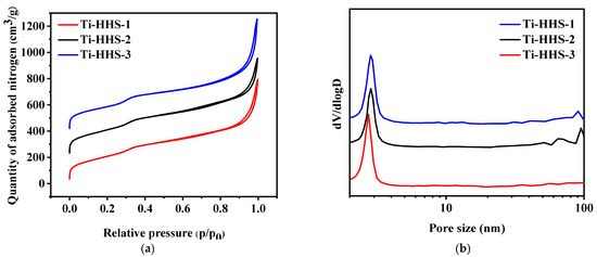 Nitrogen adsorption–desorption isotherms (a) and pore size distribution curves (b) for Ti-HHS-1, Ti-HHS-2, and Ti-HHS-3.