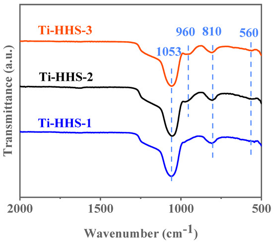 As shown in the FT-IR spectra in Figure 7, all three samples exhibit characteristic absorption peaks at 810 cm−1 and 1053 cm−1. These absorption peaks correspond to the symmetric and asymmetric Si–O–Si stretching vibrations, respectively, which are typical features of amorphous silica in infrared spectra [39]. Additionally, a minor absorption peak appears at 560 cm−1 in the Ti-HHS-1, Ti-HHS-2, and Ti-HHS-3 samples. This peak is associated with the stretching vibrations of double five-membered rings in MFI structures [40], suggesting the presence of primary and secondary zeolite structural units and indicating short-range order within the samples. Each sample also shows a distinct absorption peak at 960 cm−1, attributed to Si–O–Ti vibrations [39,41], confirming the incorporation of Ti into the structure. Furthermore, the intensity of the 960 cm−1 peak decreases with lower Ti content, particularly in the Ti-HHS-1 sample, where the peak at 960 cm−1 is less prominent.