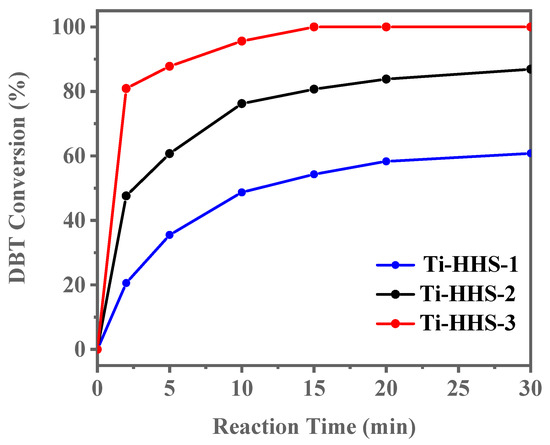 Fuel oils commonly used in daily life include petrol and diesel. Compared to gasoline, diesel contains longer alkane chains and boils in the range of 180–350 °C. To model diesel fuel, this study used long-chain alkanes, specifically tetradecane. The types of sulfur compounds can vary significantly. To further investigate the ODS performance of Ti-HHS-3, other sulfur compounds, specifically 4-MDBT and 4,6-DMDBT, were selected to evaluate their ODS performance with Ti-HHS-3 as the catalyst in model diesel. The experimental results (Figure 15) demonstrate that Ti-HHS-3 exhibits excellent catalytic activity in both short-chain alkanes (n-octane) and long-chain alkanes (n-tetradecane), with no significant difference in catalytic performance between the two alkanes. However, the presence of methyl groups in the molecular structure of 4-MDBT and 4,6-DMDBT introduces steric hindrance, limiting interaction between the reactive Ti sites on the catalyst and the sulfur compounds [51,52]. Consequently, the conversion rates for 4-MDBT and 4,6-DMDBT are lower than that of DBT at the 2 min, 5 min, and 10 min mark, highlighting the impact of molecular structure on ODS efficiency and providing valuable insights for the desulfurization of diesel oils.