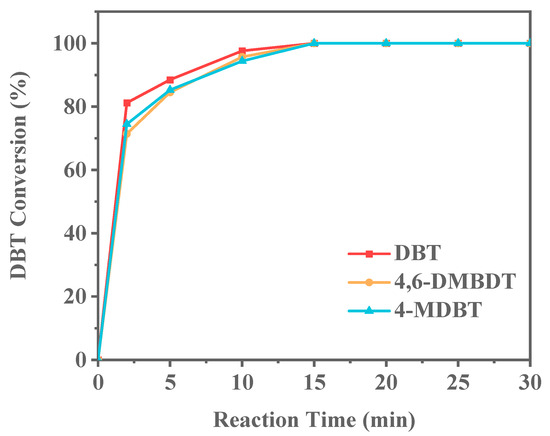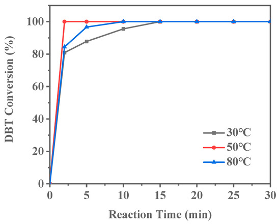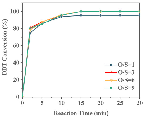 As shown in Figure 12, with an O/S ratio of 1, the DBT conversion rate reaches 95.51% within 30 min, but complete conversion is not achieved. A closer examination of the conversion rate over time reveals a plateau after 15 min, indicating that this ratio is insufficient for full DBT conversion. When the O/S ratio is increased to 3, DBT conversion reaches 100% within 15 min. With further increases in the oxidant ratio to 6 and 9, the conversion of DBT did not change too much. These findings suggest that an optimal O/S ratio exists for efficient DBT conversion while minimizing oxidant consumption. Accordingly, an O/S ratio of 3 is identified as optimal, and all subsequent investigations in this study are based on this ratio. It was reported that octane could not be oxidized by TBHP below 80 °C [50]; thus, in our experiments, the oxidation of model oil by TBHP could be neglected.