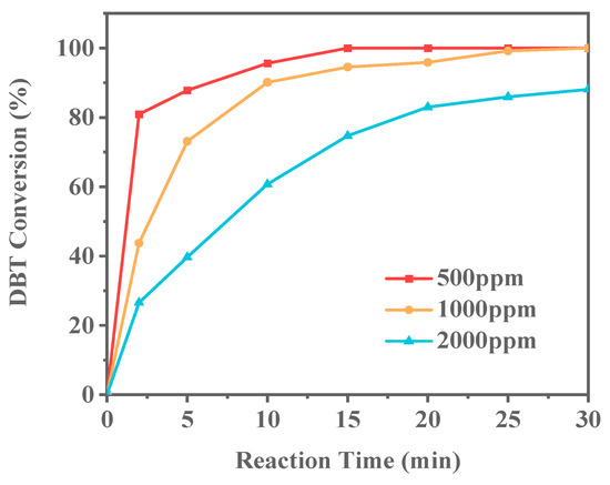 In industrial applications, the concentration of sulfur compounds in fuel oil can vary significantly. To more accurately simulate the sulfur concentrations found in actual fuel oils, Ti-HHS-3 was selected as the catalyst to conduct the ODS reaction on model gasolines with different sulfur contents. The model gasolines were prepared with sulfur concentrations of 500 ppm, 1000 ppm, and 2000 ppm, as shown in Figure 13. As the DBT concentration increased, the conversion rate of the sulfur compounds significantly decreased over the same period. Notably, when the DBT concentration reached 2000 ppm, complete conversion could not be achieved within 30 min. This may be attributed to the relatively low Ti doping in Ti-HHS-3, resulting in insufficient catalytic active sites to meet the demands of the reaction at high concentrations, thereby causing a significant decline in catalytic activity.