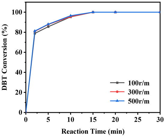 In addition to the factors mentioned above, the effect of stirring speed on the ODS reaction should also be examined (as shown in Figure 16). For consistency, the stirring speed was maintained at 300 r/min in other experiments. The results show that the catalytic activity of the ODS reaction remained largely unaffected by changes in stirring speed. Specifically, whether the stirring speed is set at 300 r/min or adjusted to 100 r/min or 500 r/min, the ODS reaction proceeds similarly. This indicates that, under the experimental conditions used, stirring speed only slightly impacts on the catalytic activity of the ODS reaction.