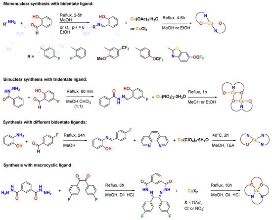 Main synthetic routes for obtaining fluorinated Schiff base Cu(II) complexes.