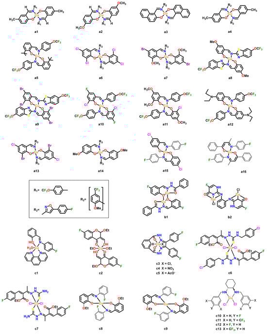 The most recent work presenting results of antimicrobial activity is that reported by Kaştaş et al. The c8 and c9 complexes containing fluorine improve the activity compared to the ethoxy-containing analog when tested against S. aureus, B. cereus, E. coli., P. aeruginosa, C. parapsilosis, and C. krusei [44]. In this study, the position of fluorine in the aromatic ring plays an important role in the activity, since c9 (fluorine in the meta position) is more active (inhibition zone = 9 mm for S. aureus and 16 mm for C. parapsilosis) than the other compounds; however, the inhibition does not exceed the effect of commercial antibiotics. Finally, Habala et al. reported the antimicrobial activities of the copper complexes c10–c13, which were evaluated in vitro against Gram-negative (E. coli) and Gram-positive (S. aureus) bacterial strains and against the yeast C. albicans [45]. In this work, it is found that Cu(II) complexes are more active against bacterial strains than against fungi, and in general, there is no selectivity between Gram-positive and Gram-negative bacteria; however, a clear synergistic effect is observed, since the complexes are more active than the free ligands. This can be explained based on the Overtone concept and Tweedy’s chelation theory, where lipophilic compounds are more likely to pass through the lipid membrane surrounding the cell while the chelation of a metal ion reduces its polarity, also increasing the lipophilicity of the compound.