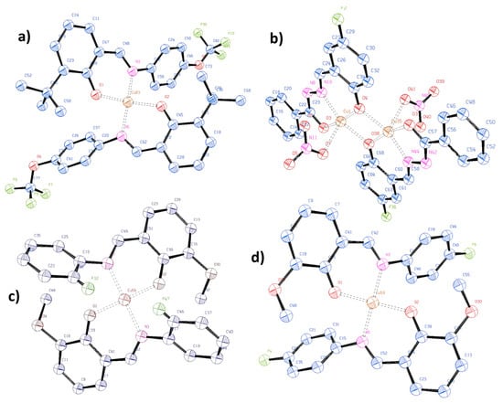 X-ray crystal structure of complex a5 (readapted from Ref. [34]; Copyright© 2020 Elsevier Ltd.) (a), molecular structure of complex b1 (readapted from Ref. [39]; Copyright© 2020 Elsevier Ltd.), (b) and molecular structure of complexes c8 (c) and c9 (d).
