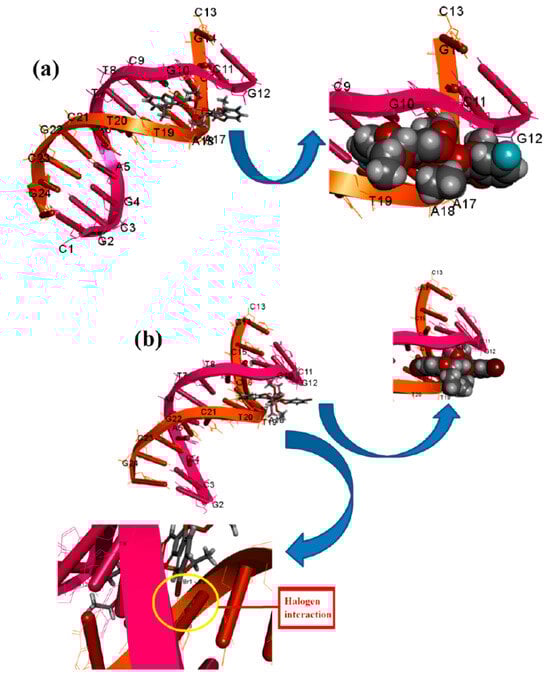 In silico evaluation of (a) complex c2 and (b) its brominated derivative in the presence of (CGCGAATTCGCG)2 (PDF ID: 1BNA) dodecamer sequence of DNA helix (Adapted from Ref. [53] Copyright© 2020 Elsevier Inc.).