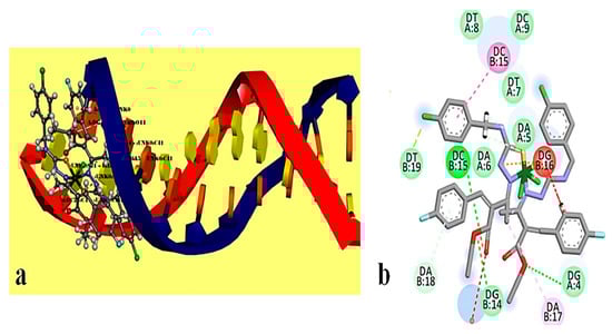 Three-dimensional (a) and two-dimensional (b) docking evaluation of complex c7 with CT-DNA (adapted from Ref. [43]; Copyright© 2023 Elsevier Ltd.).