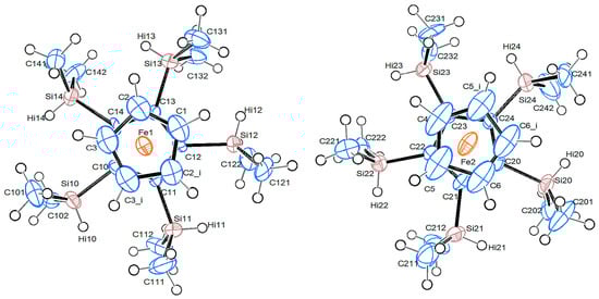 - Rupf, S.M.; Sievers, R.; Riemann, P.S.; Reimann, M.; Kaupp, M.; Fasting, C.; Malischewski, M. Persilylation of ferrocene: The ultimate discipline in sterically overcrowded metal complexes. Dalton Trans. 2023, 52, 6870–6875. [Google Scholar] [CrossRef]
