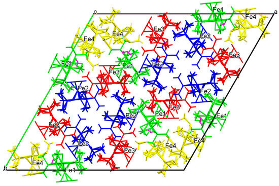 The structure shows the typical chiral “paddle-wheel” orientation of such molecules (the corresponding enantiomer is automatically generated by the application of the mirror operator), which has also been described for the structures of [Mn{C5(SiMe2H)5}(CO)3] [17] and [Fe{C5(SiMe2H)5}2] [21]. Due to a lack of further crystallographic symmetry restrictions, the disorder also found in these structures could be refined to different values from 1:1. Similar cyclic tongue-and-groove arrangements are observed for hexakis(dimethylsilyl)benzene, and the stereochemistry was proven to be dynamic in solution [31], while at the same time, disorder was observed in the crystals of [C6(SiMe2H)6] and its M(CO)3 (M = Cr, Mo, W) complexes [32]. Although the steric congestion between silyl substituents at a five-membered ring is smaller than on a six-membered ring, it still prevents the easy rotation of the SiMe2H substituents. It therefore seems justified that the chosen restraints correspond to a “real” situation and are not an artifact. On the other hand, the large number of distance restraints makes a detailed discussion of bond lengths and angles senseless. The distances from the Fe atoms to the centroids of the substituted Cp rings average at 1.647(7) Å and to the centroids of the unsubstituted Cp rings at 1.665(9) Å. Apparently, and quite surprising, despite the expected steric crowding at the substituted Cp ring, the unsubstituted C5H5 ring is further away from the metal. However, a similar observation was made in the crystal structure of pentakis(isopropyl)ferrocene, which has also one sterically crowded Cp ligand [33]. Individual Fe–C distances vary between 2.006 and 2.116 Å for the substituted and between 2.044 and 2.064 Å for the unsubstituted Cp ring. Angles between Fe-Ct vectors at Fe atoms Fe1, Fe2, and Fe3 are close to 180° (the highly disordered C5H5 ring at Fe4 is excluded from discussion). The average distance of the Si atoms from the corresponding Cp carbon atoms is 1.874(5) Å. For comparison, in the structure of decakis(dimethylsilyl)ferrocene, the Fe centroid distance is 1.716 Å, very much longer than in 13a, and the C–Si distances average at 1.879 Å, quite similar to the value found in our compound [26]. Figure 2 displays a packing plot of 13a, which shows that the different molecules A-D arrange very differently.