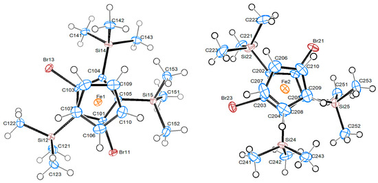 The bond parameters of both molecules are nearly identical. When comparing with the structure of 4a, the Fe atom is closer to the substituted Cp ring than to the unsubstituted in both molecules, but both distances are longer in 8a, while the difference in distances becomes smaller on increasing silyl substitution. In 4a, both silicon atoms are very close to the Cp ring plane, while in both molecules of 8a, only one Si atom is in the Cp ring plane (the Si atom between the Br substituents), while the other two deviate in both directions significantly from this plane.