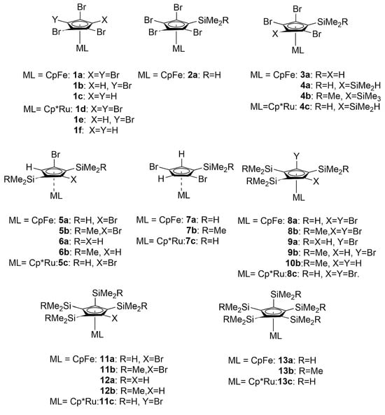 Solvents for reactions (THF, Et2O) were obtained commercially in the highest available anhydrous quality and stored under dry N2. Solvents for chromatography were of analytical grade and were used as obtained. Reagents HTMP, 1.6 m n-BuLi, 1.6 m t-BuLi, and 1.0 m LDA were obtained commercially and were used as obtained (it is advisable, however, to use either freshly opened commercial vials, or titrate the reagents prior to use!). Reagents SiMe2HCl and SiMe3Cl were obtained commercially, stored over Reillex ®, and freshly distilled over CaH2 prior to use. LiTMP was freshly prepared from HTMP and n-BuLi in THF prior to use. The ferrocenes pentabromoferrocene 1a, tetrabromoferrocene 1b, and 1,2,4-tribromoferrocene 1c as well as pentabromo-pentamethyl-ruthenocene 1d were prepared as reported earlier [30,42]. All reactions were performed under dry N2 or Ar, using standard Schlenk techniques (Schlenk flasks/tubes were stored in a hot oven at 160 °C for at least 24 h and were assembled under a purge of inert gas while still being hot. The assembled flasks were then evacuated using standard oil vacuum pump (ca. 0.01 Torr) and then flushed with inert gas.