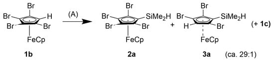 1-Dimethylsilylferrocene “FcSiMe2H” was described in 1990 [27], but there are no other ferrocenes which have SiMe2H groups only on one Cp ring. We decided to first try an approach that worked on the cymantrene system: treating pentabromoferrocene 1a with one or two equivalents of n-butyl lithium followed by an electrophilic quench with SiMe2HCl. However, when using one equivalent of n-BuLi at −50 °C, a 73:4:6:15 mixture of the desired [Fe(C5Br4SiMe2H)(C5H5)] (2a) with 3a and 4a (for structures, see Scheme 1) and the hydrolysis product 1b (in addition to traces of 1a and 1c) was obtained. Using two equivalents of n-BuLi afforded an even more complicated mixture of compounds 2a, 3a, 4a, and 8a in a 13:22:27:3 relation, together with contamination with traces of 1a and the hydrolysis products 1b (28%) and 1c (9%). These apparently “unexpected” results are, however, not without precedent. Complicated product mixtures were also obtained when we tried an electrophilic cyanation with the pentabromoferrocene/n-BuLi system [28].
