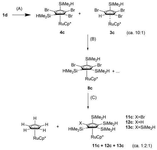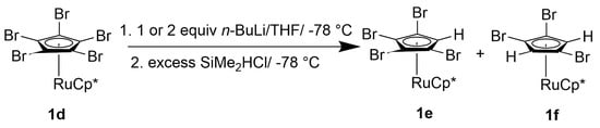 Overall, 1′-trimethylsilyl-(1,2,3,4,5-pentamethyl) ruthenocene, 1,3-bis(trimethylsilyl)ruthenocene, and 1,1′,3,3′-tetrakis(trimethylsilyl)ruthenocene were prepared [4,15,29]. Notably, 1,1′-Bis(dimethylsilyl)ruthenocene has also been described [27], but no dimethylsilyl derivatives of pentamethylruthenocene are known. As we had described the synthesis of [Ru(C5Br5)(C5Me5)] (1d) previously [30], we regarded it as a suitable starting material for the multiple introductions of SiMe2H groups. First, we treated 1d with one or two equivalents of n-BuLi followed by electrophilic quench with SiMe2HCl. However, no silylated products were obtained. Instead, only the hydrolysis products 1e,f of the anticipated intermediate lithiated species could be isolated (Scheme 5).